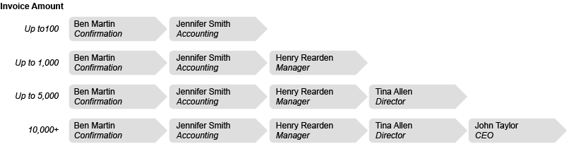In the example below, there is a separate workflow for each tier in the hierarchy. Rules determine which workflow an invoices is sent to, based on the invoice amount. Jennifer can approve invoices up to $100, Henry can approve invoices up to $1,000 and so on.