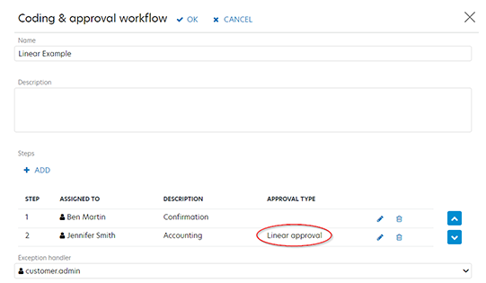 This example uses a linear approval step, where Jennifer has a monetary limit of $100, and Henry is specified as her manager. Henry has a limit of $1,000, and Tina is specified as his manager and so on.