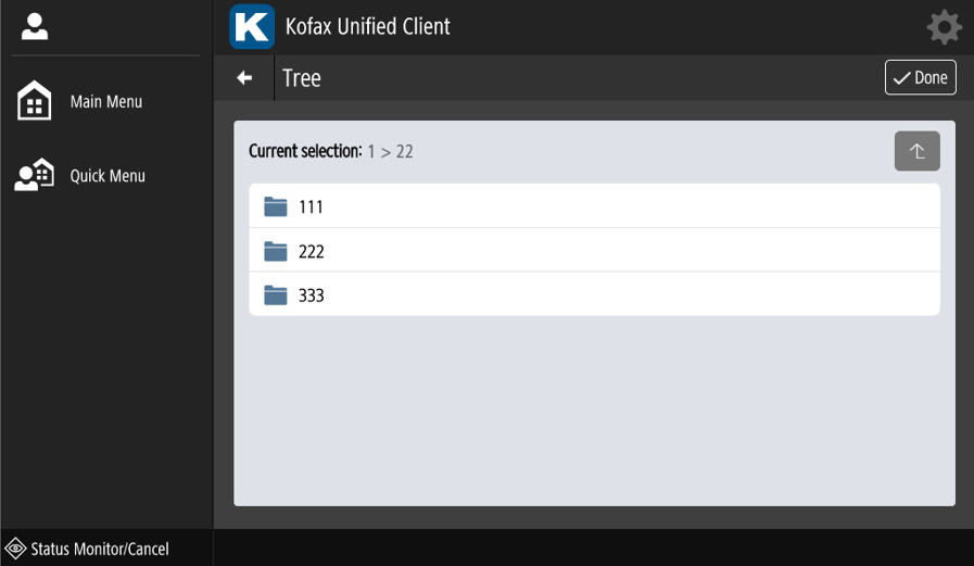 The tree field can be used for either navigating in a predefined tree or in a folder structure (the latter requiring server interaction while navigating). The path separator changes according to the type of tree. The selection is not modified until the tree window is dismissed by the Done button in the title bar. Leaving the window by using the left arrow acts as Cancel and does not alter the selection.