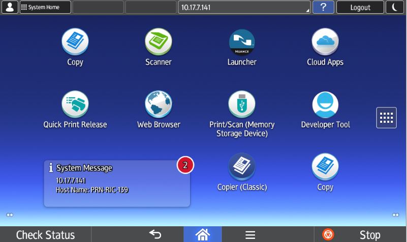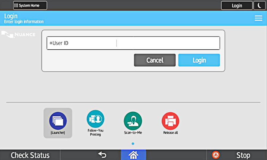 To log into Unified Client for Ricoh Smart Operation Panel 1.1, users must login from the SOP's login screen. This means the SOP must be running before logins are permitted. If the MFP displays the Ricoh Smart Operation Panel Home screen, users must first press the Login button on the top menu bar to start the Unified Client for Ricoh Smart Operation Panel 1.1.