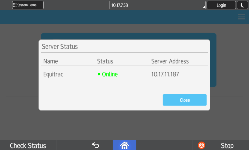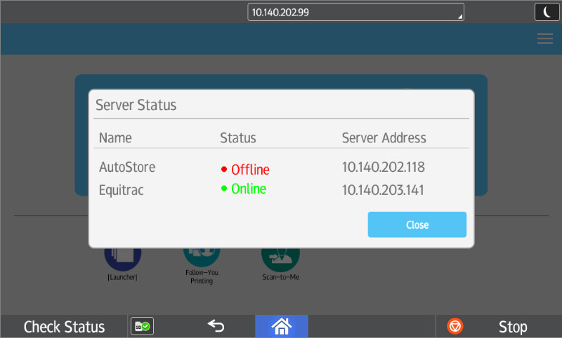 After the Unified Client for Ricoh Smart Operation Panel 1.1 starts, a Server Status screen appears.