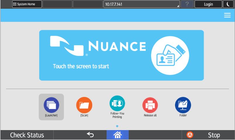 - Login button: Presents the login screen to authenticate and gain access to the Unified Client for Ricoh Smart Operation Panel 1.1.