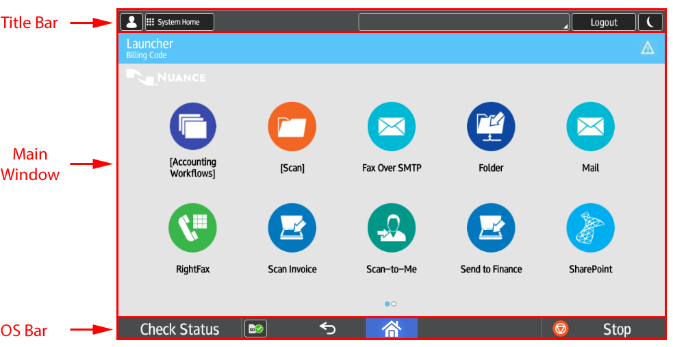 The Unified Client for Ricoh Smart Operation Panel 1.1 user interface is touch-based. Use your finger or a pointing device such as a stylus to make common touchscreen type gestures, type on the soft keyboard, scroll lists of options, and perform certain system commands. Users can swipe the screen to reveal more options, as indicated by the carousel dots. The screen requires that minimal pressure be applied when navigating the system. The user interface for the Unified Client for Ricoh Smart Operation Panel 1.1 is presented in three areas: