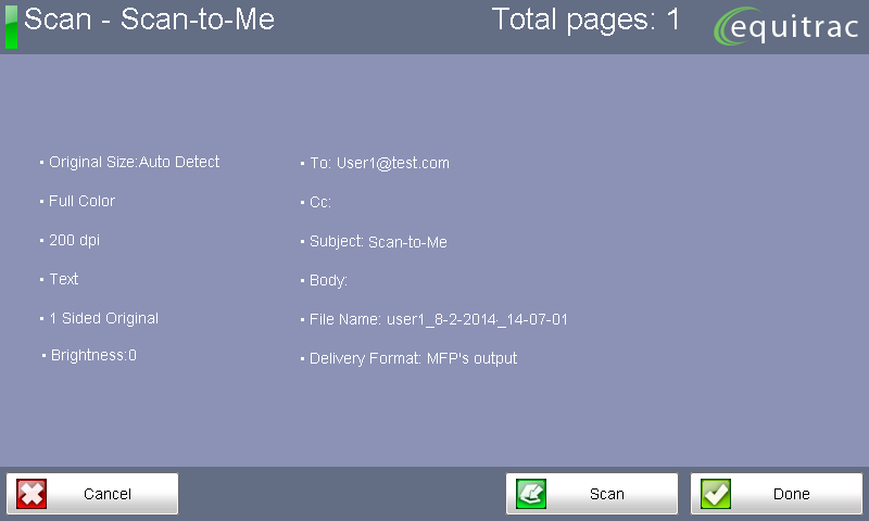 When the Scan Job, containing all Documents for this session is completed the Done Document screen appears.