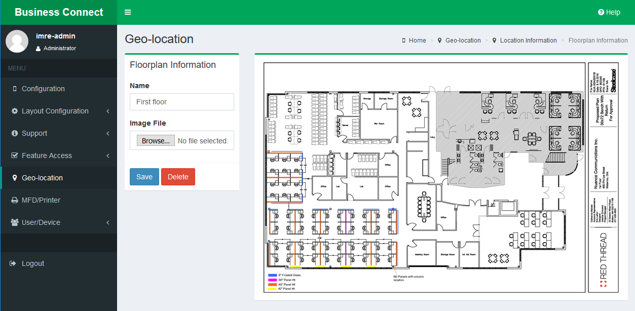You can optionally provide floorplans for your building locations. Floorplans offer users a detailed view of where the MFDs or printers are located. Floorplans are linked to specific building locations, and if needed, multiple floorplans can be linked. For example a building may have multiple floors and you can provide a floorplan for each floor.