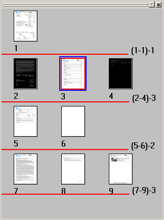 Horizontal red lines break groups of pages to be sent to AutoCapture into separate documents. The numbers to the right of a split show the page range for a document and the number of pages in the document. The active document contains the page that is displayed in the Document window. The active document is sent to AutoCapture by the Send to AutoCapture command on the Document menu. The thumbnail for this page is highlighted with a blue border in the Thumbnail window.