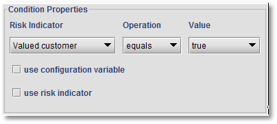 The Risk Indicator field is a drop-down box containing all risk indicators that have been specified for this customer by configuration. Please note that the condition detail view does not offer access to risk indicators that have been disabled in the settings dialog.