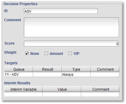 An Interim Variable must be chosen from the combo box of available variables. Each interim variable can only be used once per decision.