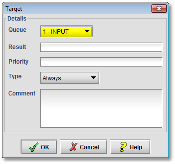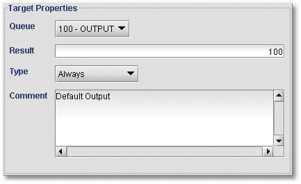Targets define the queue(s) where the item is routed to. A target is defined by a queue name, an optional result value that defines the value of the item in the new queue and a type. All these fields are mandatory. Optionally, a comment may be specified.