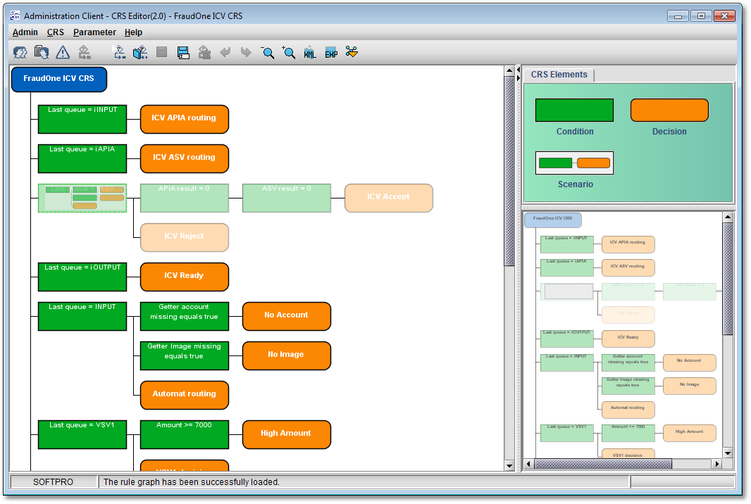 Rules are displayed within a tree view manner in the main area of the panel. The tree consists of condition nodes that evaluate exactly one risk indicator, a default target node, and decision nodes. These nodes are organized in risk scenarios where each scenario terminates in exactly one decision node for the risk scenario, and one or more condition nodes. A decision will be evaluated only if all conditions of the scenario are true (AND relationship).