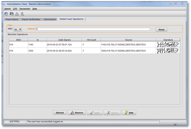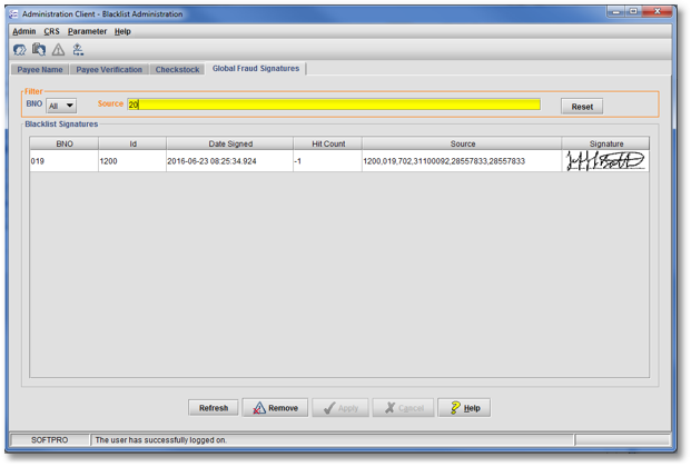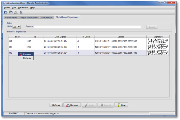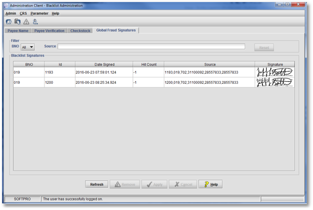 | Refresh | The Refresh button re-reads all records from the server. It might be helpful when an administrator wants to get up-to-date list of Global Fraud Signatures from the server. |