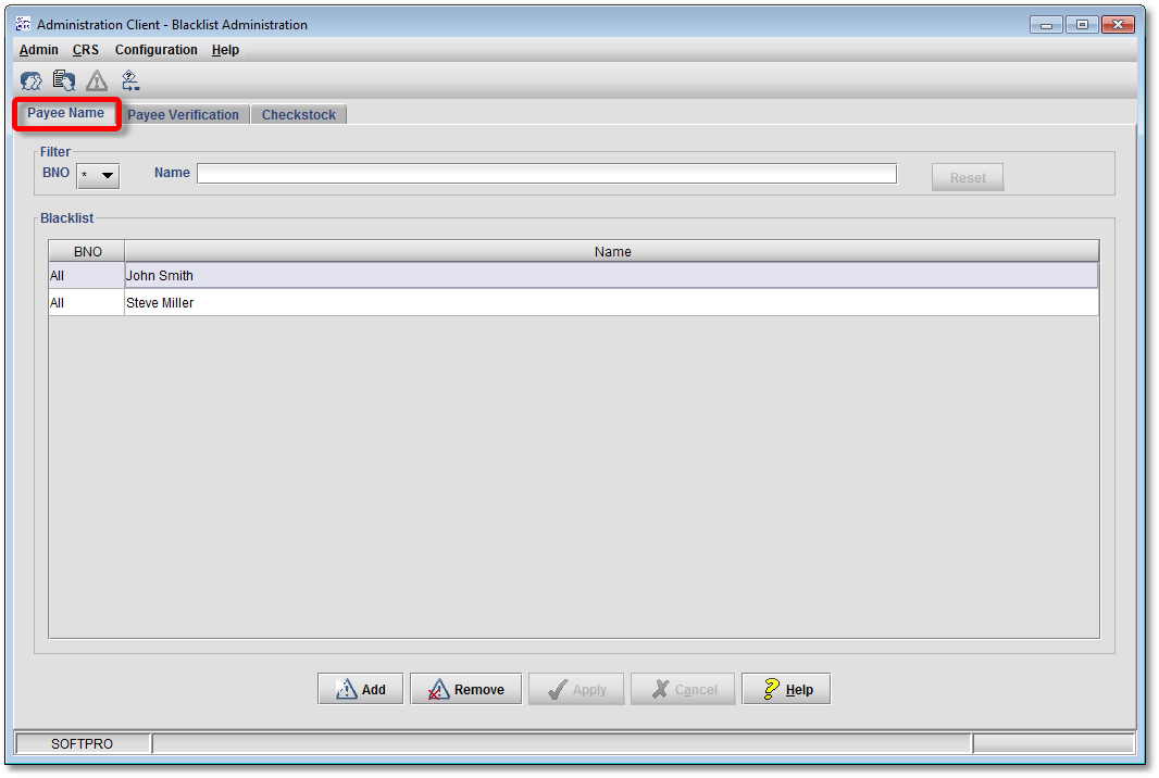 In the Payee Name view the user can maintain the list of suspect payee names.