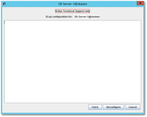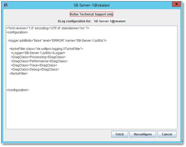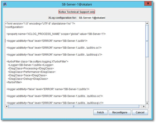 The dialog can be used to send new log and trace configuration information to the selected server or to retrieve the current configuration (also to allow it to be modified after retrieval). Typically, Kofax technical support will provide you with the text that you can paste into this window. At that point, pressing Reconfigure sends the text to the server and the servers trace and log configuration is changed accordingly.