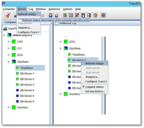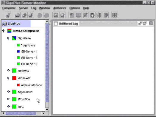 - Groups: server processes can be grouped together. The SignBase group will, for instance, contain all servers related to the SignBase functionality. This gives you an overview of the status of a functional group.
