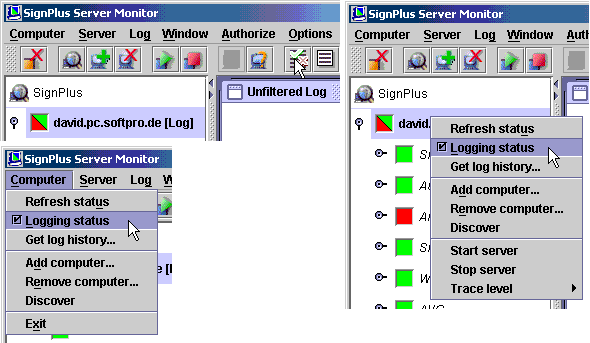 Select the computer you want to have a closer look at and pick Computer > Logging status from the menu. Selecting a server will have the same effect as selecting the computer it belongs to. Alternatively you can use the popup menu (by right clicking on an item) or click the Log button to start logging.