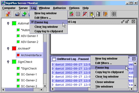 The currently active log window will now stop displaying new messages. This is shown by the word ‘Paused’ in the title bar.