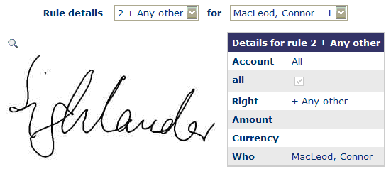The third column shows all the rules defined for the signatory, if possible. Principally, only rules that are valid at the current date (see also Status Bar) and that are related to either the current account or all accounts of the current costumer are displayed. For deposition reasons, only the first 6 valid rules will be displayed automatically. If more than 6 rules are defined for this signatory, they can be displayed in the Detailed View.