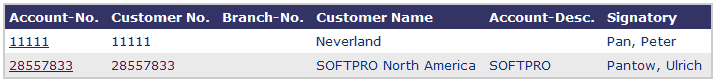 It’s principally possible to fill in only parts of names in the customer name, account description and signatory last and first name fields, but wildcards (*, ?) are not allowed. Also, the search procedure is not case-sensitive.