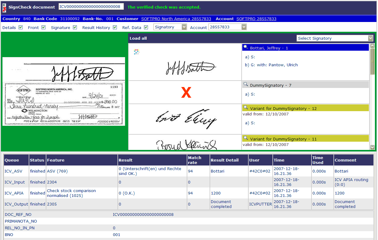 After receiving the verification feedback from the server, the client presents you the result(s). The check is shown in the left part of the screen together with the request data below the check. Verification results are displayed below corresponding reference data on the right side. The status whether the check was accepted or rejected is shown prominently.