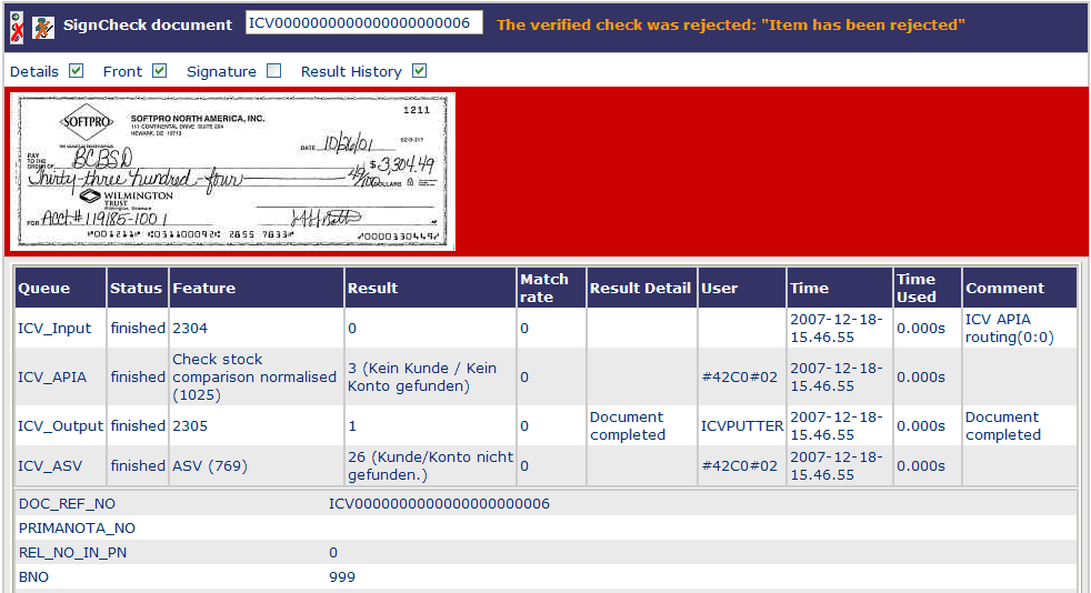 If the verification indicates that something must be wrong with the check, it is displayed with a red reject message and a red frame.