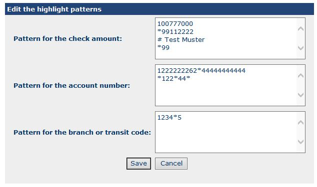 The Edit highlight pattern can be used to set system wide check highlighting patterns to be used in marking checks which may match one of the patterns to be interesting in the fraud analysis.