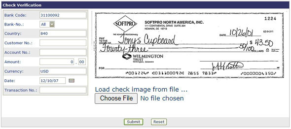 The user has the possibility to load a check image from either a central location or the local file system. A Load image button on the page triggers the action. The image is displayed afterwards directly in the ICV request page.