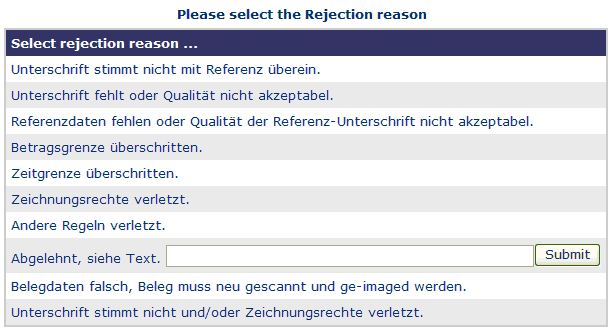 With this action the reject the current document, which means the check reveals irregularities or missing data. By clicking a new view is loaded, showing a list of reject reasons. You may either choose one of the default reasons or insert an own free text under "rejected, see text".