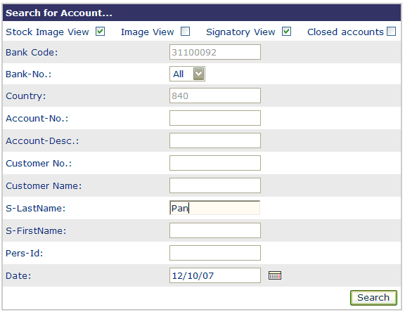 The entry produces a list of fitting customers having a signatory with this name and all their accounts.