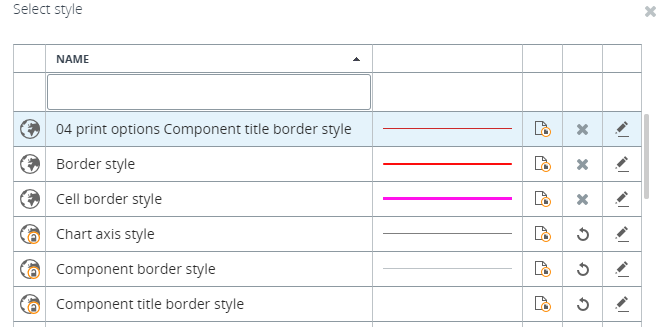 For example, select the Border style.The Select style window appears with all styles of the selected type (all border styles in our example) with the selected style being highlighted and in focus.
