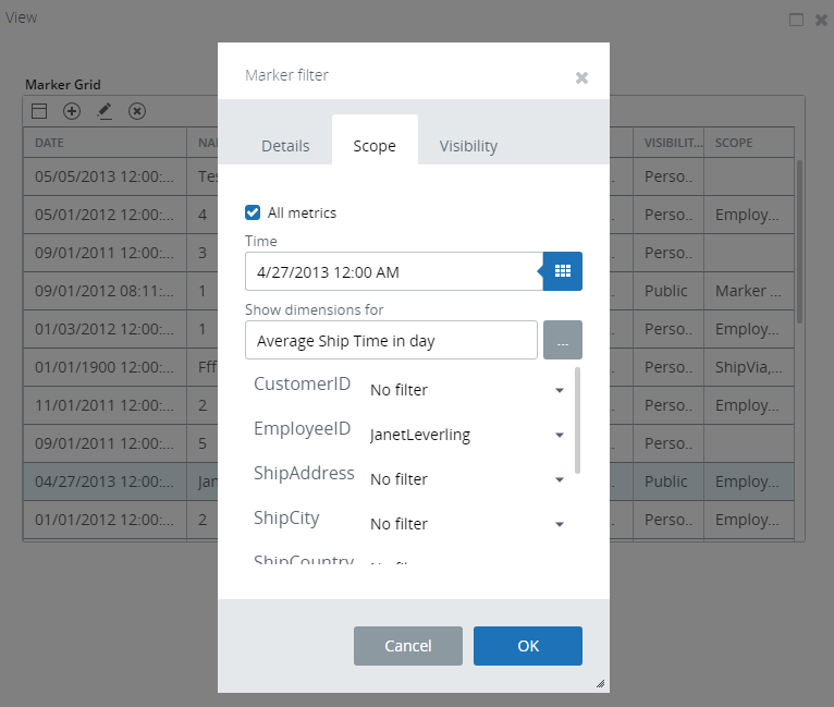 Select All metrics to use this marker for all metrics. If you clear this check box, the marker is used only for the dimensions selected under the Show dimensions for parameter.