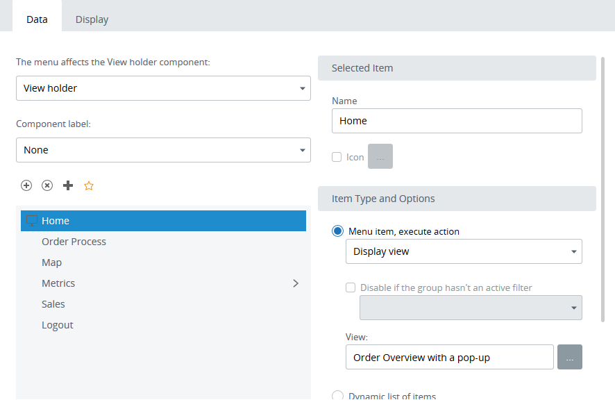 - Set the default View for the View holder component: click Add New Data, highlight the new line, click the ellipsis icon, and select the Order Overview View from the Documents Tree. Click OK.
