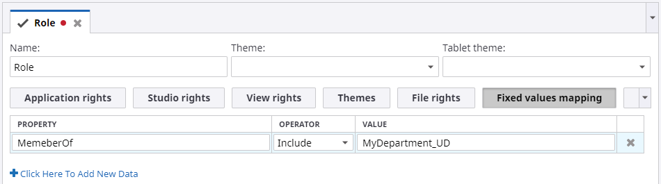 - Define the elements for the role such as Application rights, View rights, Studio rights, Themes, Fixed values mapping, or External DB mapping.