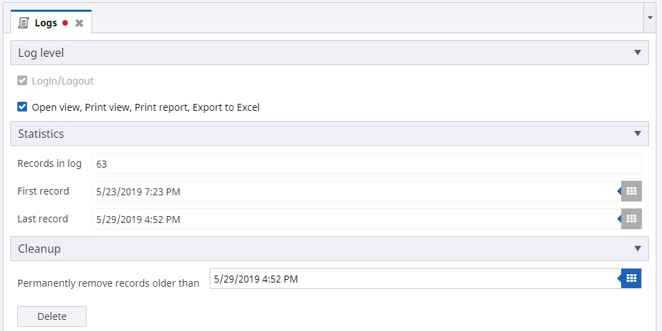 Use the Logs pane to specify the log level events, see the statistics, and define the log cleanup.