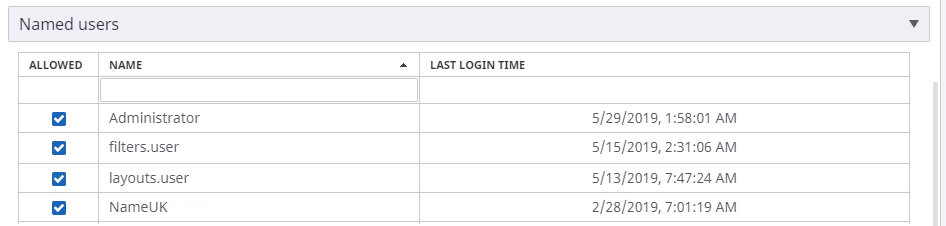 , an unlimited number of unique users are allowed. If this box displays a positive number, it specifies how many users can log in to any application.In the Named users section below, you can disable access to the analytics for some users and allow access to the users who cannot log in because of max named users number has been reached. Select or clear the check boxes next to the corresponding users. This option is valid for the cases when a license with the limited number of users is used.