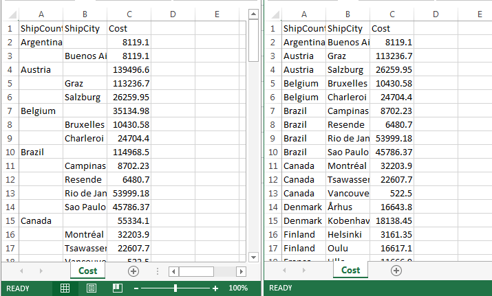 The flat export shows no totals and has all cells filled with the data, while the regular export looks like a grid in the Viewer with all drill down levels expanded.