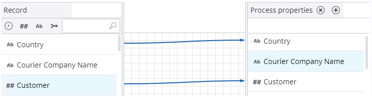 The direction of the link from the record field to the process property is significant. If the arrow goes to the right, you want to take the record field and put its value into the process property. The start node maps a process ID field from a record to the process property on the right with an arrow going to the right, to establish the record’s ProcessID field.
