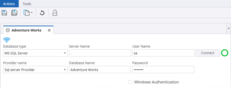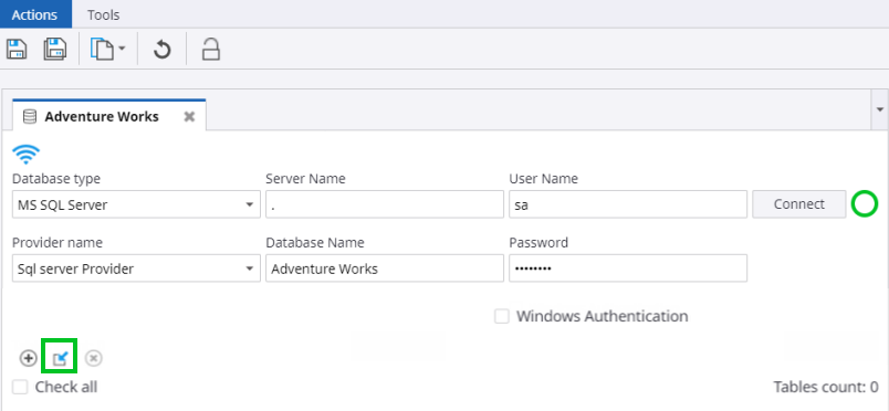Create a new data source to connect it to the imported database that comes with the sample project. For details, see Install the Sample project . When connected, get tables to use data for further processing.