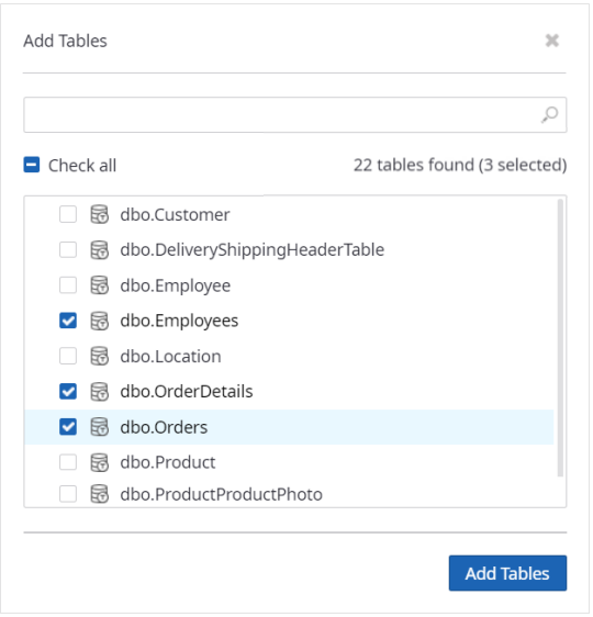 After the Add Tables dialog box is closed, the added tables are displayed on the list. -