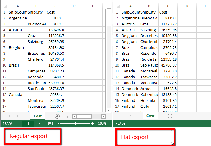 The flat export shows no totals and has all cells filled with the data, while the regular export looks like a grid in the Viewer with all drill down levels expanded.