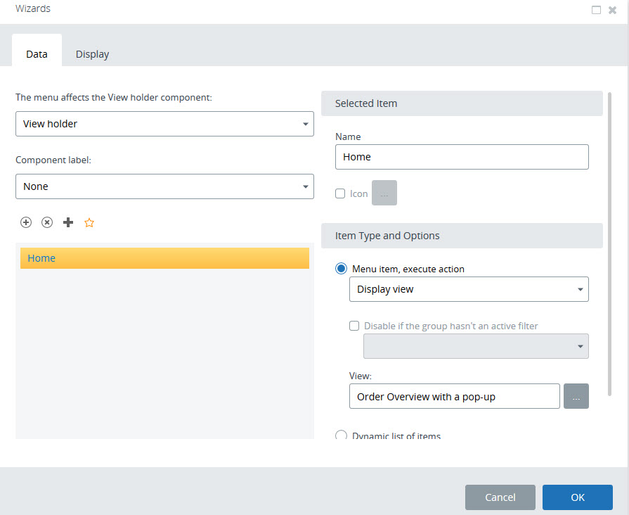 - Set the default View for the View holder component: click Add New Data, highlight the new line, click the ellipsis icon, and select the Order Overview View from the Documents Tree. Click OK.