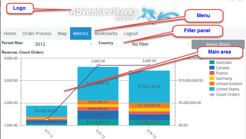 Typically, a project has one main View that is shown to the end user. This is an entry point for displaying all the required dashboards. The main project View may contain several elements: a menu, a View holder that changes the View with the help of the selected menu item, filters, a logo, and other additional elements.