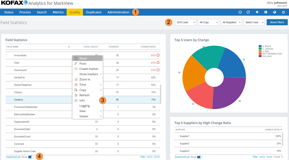 Filter pane: Use the pane that appears under the toolbar menu to select customizable options such as organizations, suppliers, invoice types, currency, and time range.