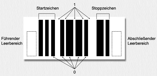 Jeder Interleaved 2 of 5-Barcode enthält eine gerade Zeichenanzahl und besteht aus folgenden Elementen: