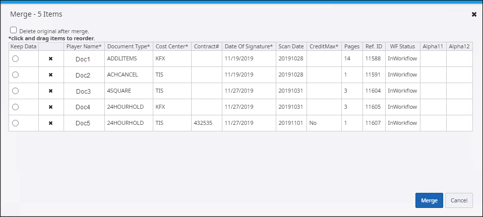 6. Select Keep Data to retain the details of an item and delete rest. Only the details of the item for which the Keep Data option is selected is retained in the merged document.