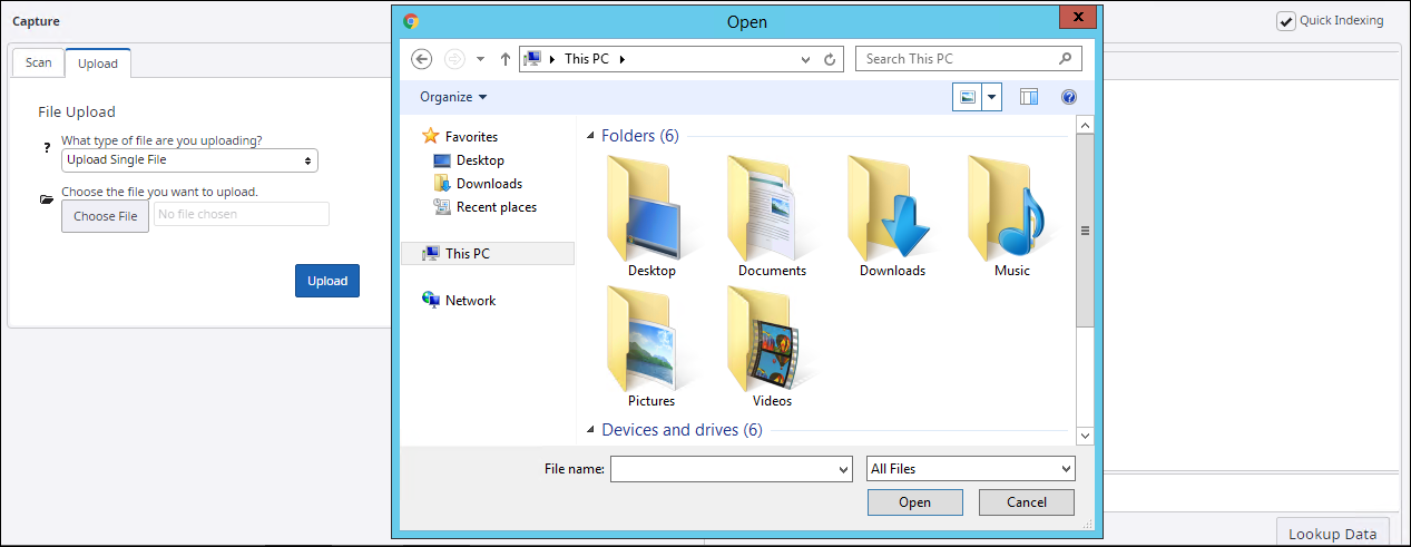 You can upload a document into the application. Use this option when there is no scanner available and if you have the soft copies of the document.