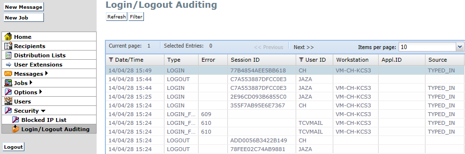 Click Login/Logout Auditing on the Security menu to access the TCOSS feature for auditing logins and logouts.