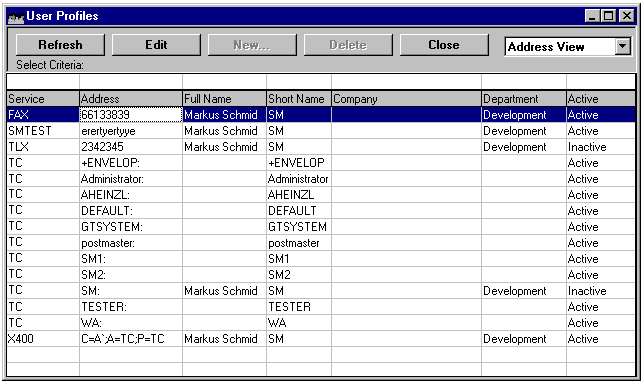 An entry opened from Address View shows the address properties by default. After editing the addresses of a user, the list view must be refreshed manually to reflect the changes. The Address View provides full filtering on all columns except Active. The Delete and New buttons are not available in this view.