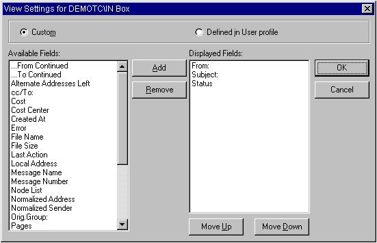 | Move Down | Moves a selected item down in the Displayed Fields list. |
