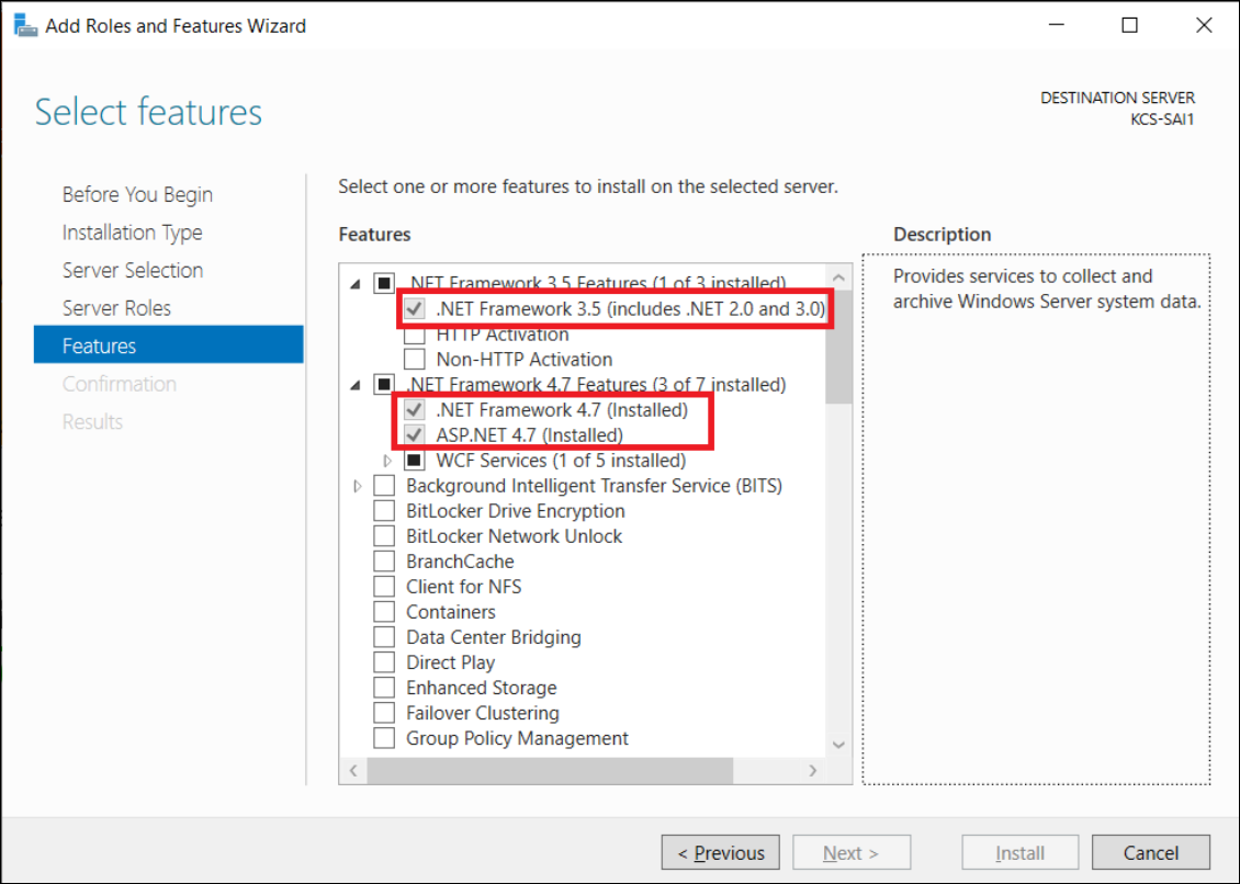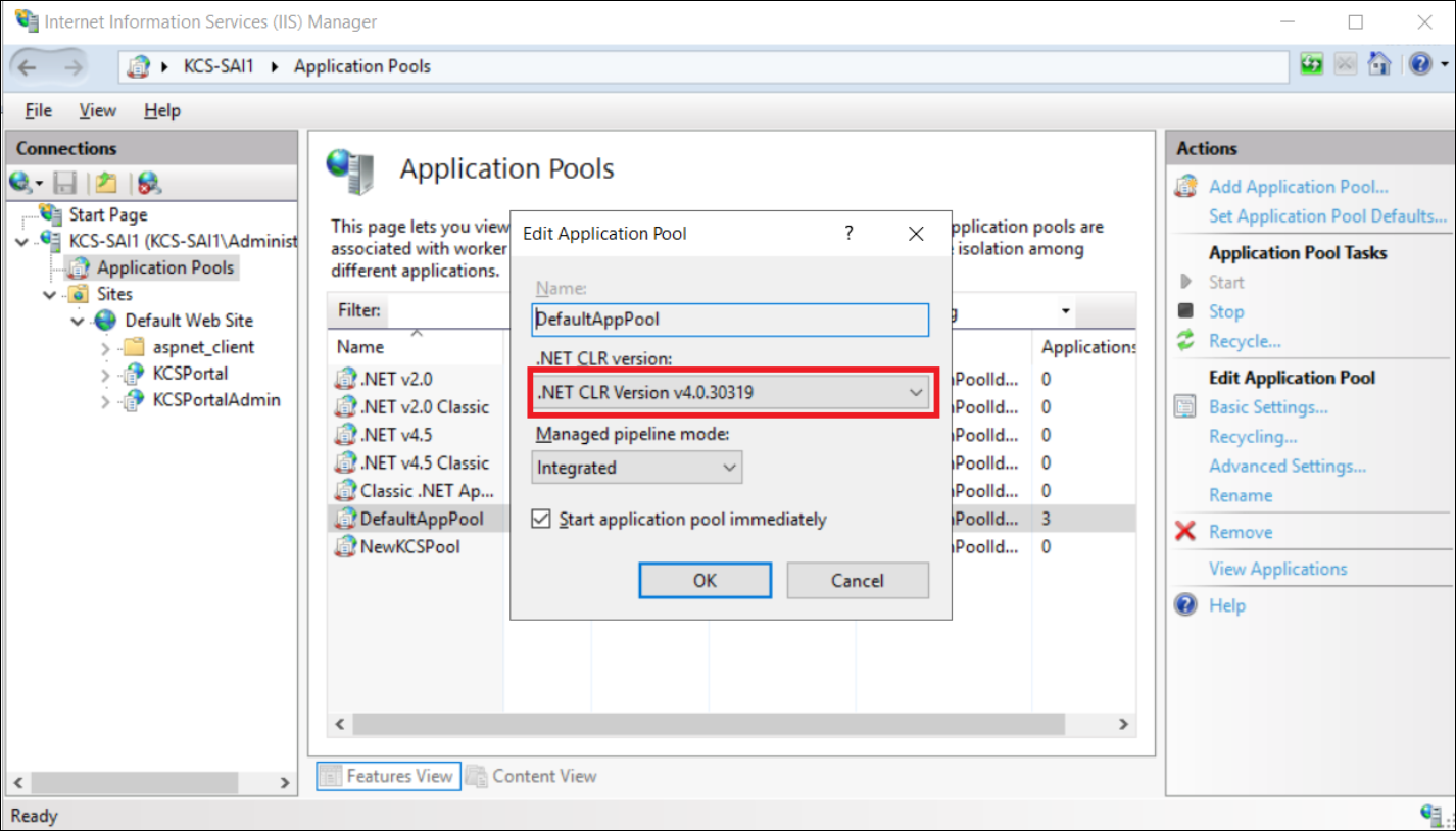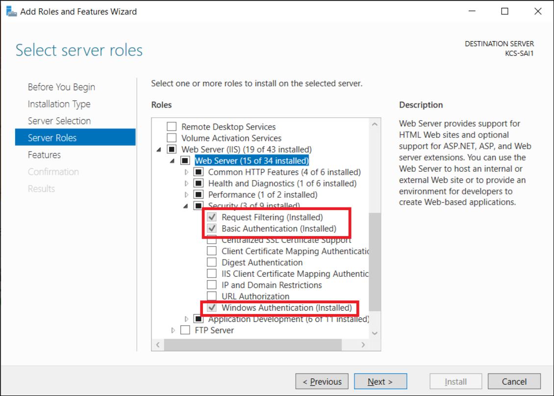 The IIS Web Server Roles and related features are enabled automatically during KCS Portal installation. If enabling of IIS Web Server fails, activate the web server manually and then install KCS Portal.
