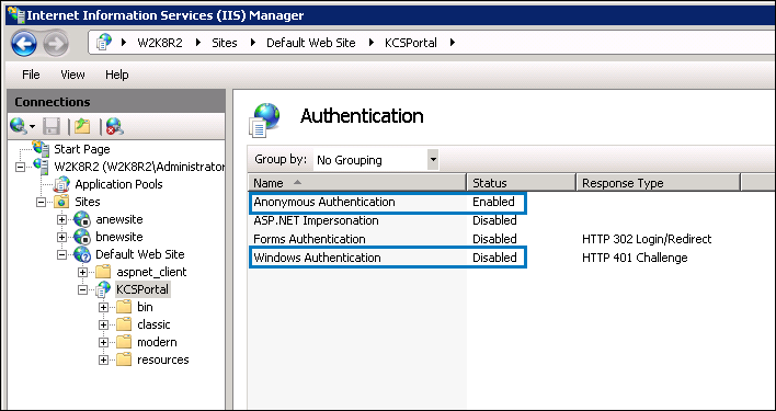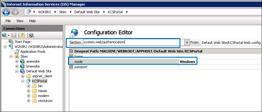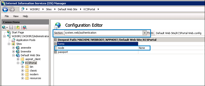 For SSO mode, update the following settings on the IIS Manager for KCS Portal.